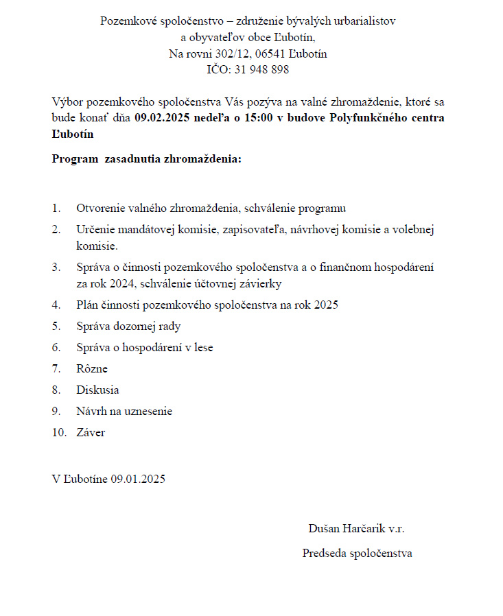 Pozvánka na valné zhromaždenie pozemkového spoločenstva
